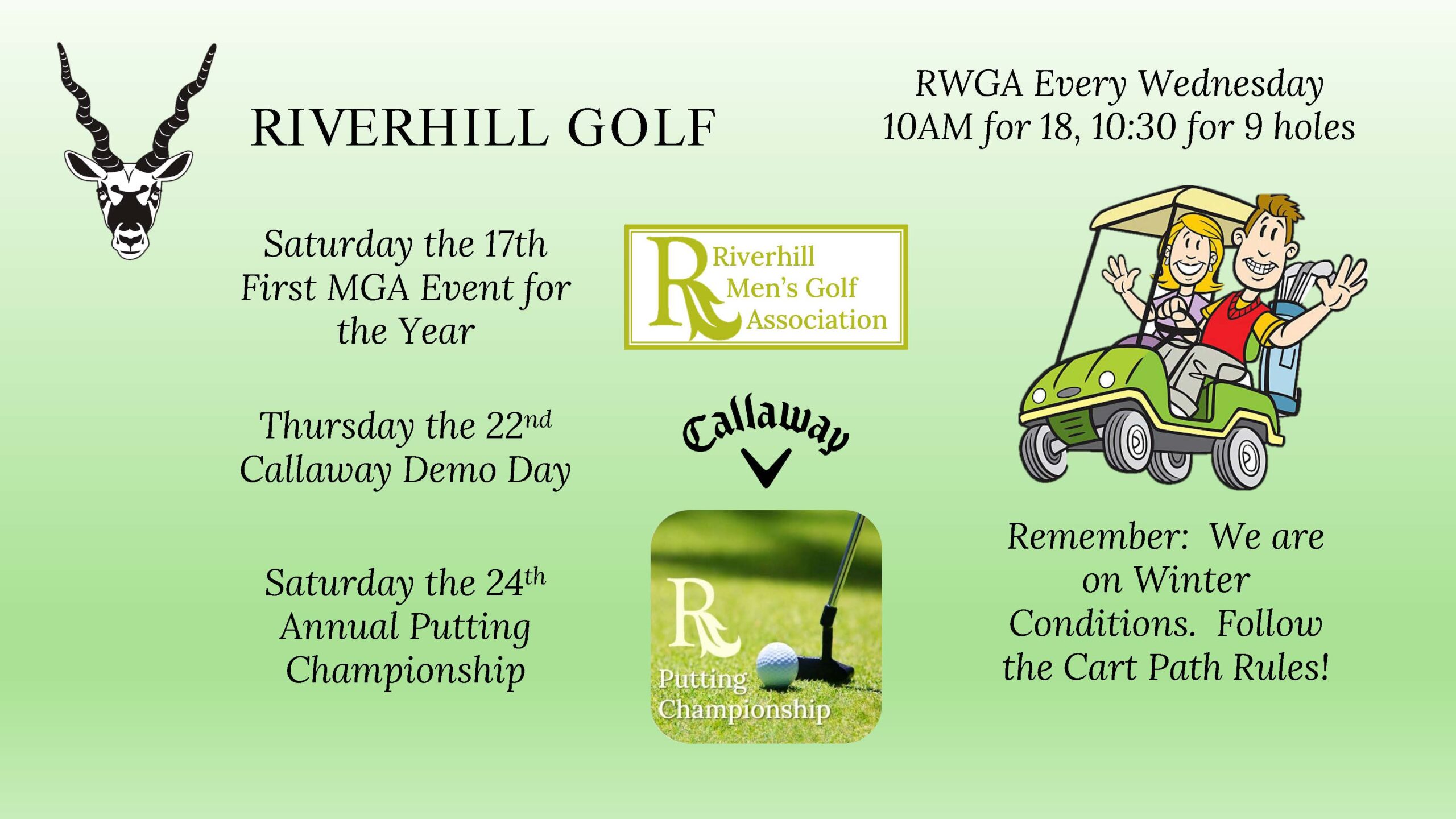 January 24th – The Putting Championship -Two person teams compete in an 18-hole putting only tournament. Teams will be flighted by team handicap.