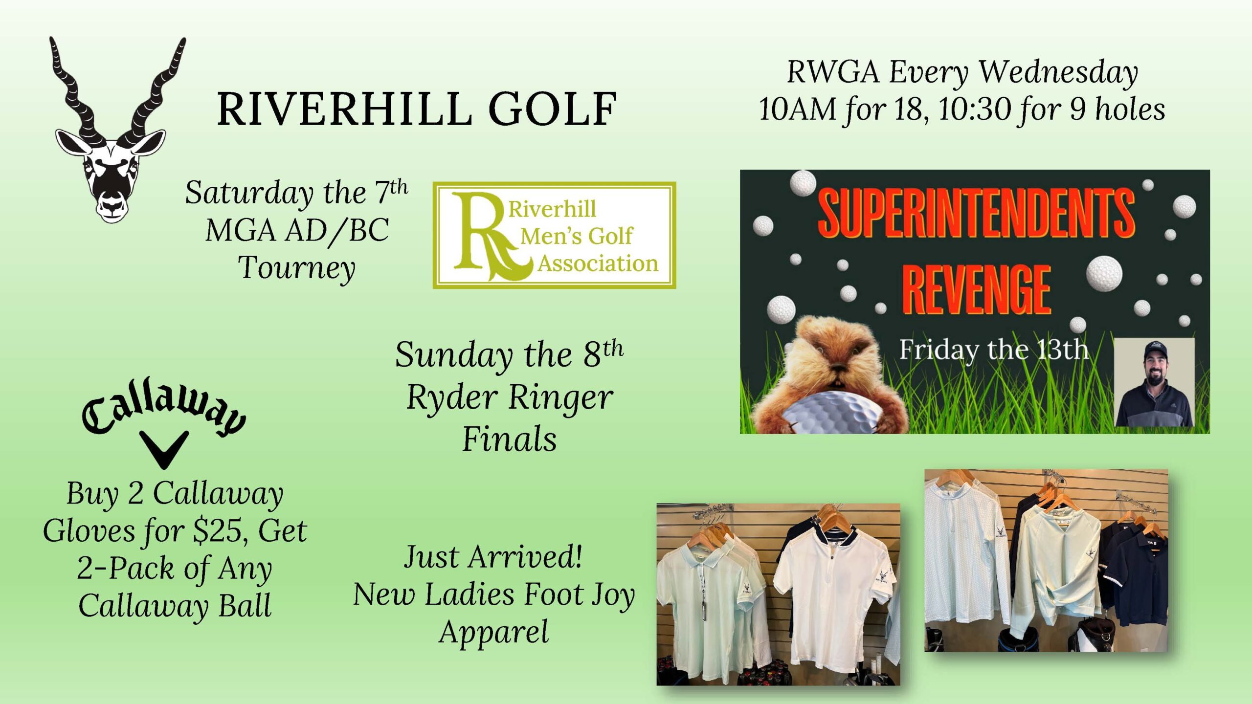 April 4th – Riverhill Cup Matches Begin- Individual Round Robin Match play, flighted and you schedule your own matches. Completion dates posted at sign up