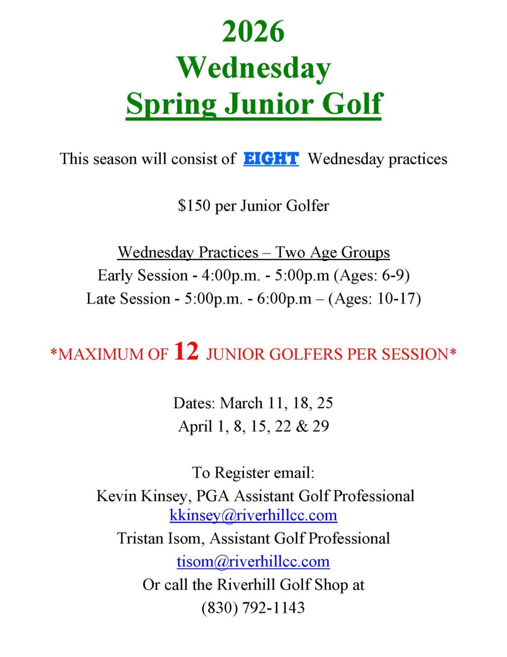 Jr. Golf Clinics Wednesday’s 4:00 – 6:00 and summer camps available