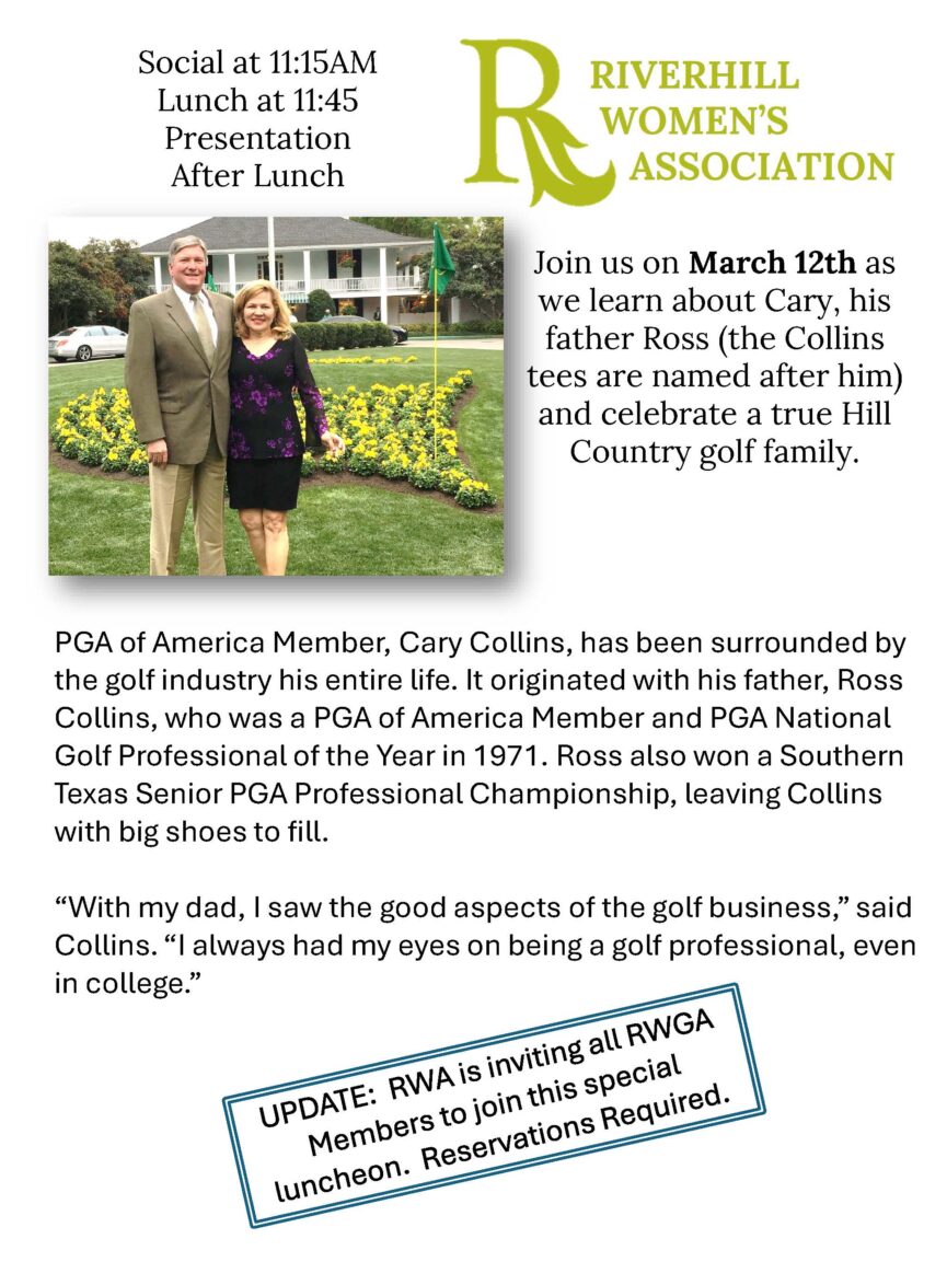 RWA Luncheon – March 12th Niel PowersMarch 9, 2026Dining, Events Reservations at (830) 896-1400 or reservations@riverhillcc.com
